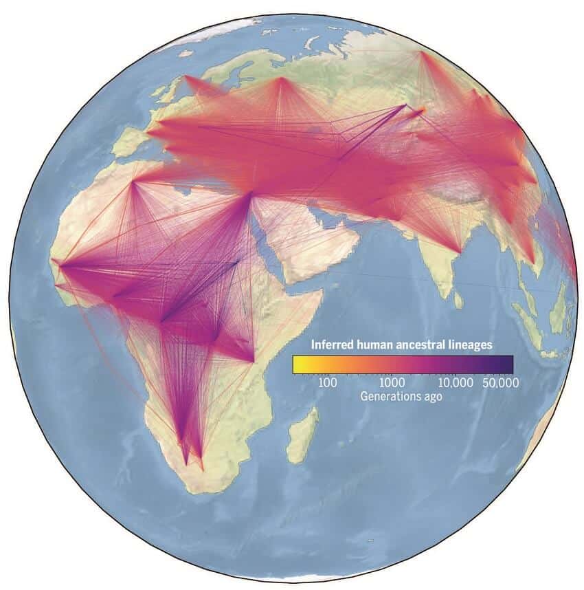 Publicado en Science , el estudio revela con un detalle sin precedentes cómo las personas de todo el mundo se relacionan entre sí. Predice ancestros comunes, aproximadamente cuándo y dónde vivieron, e incluso eventos clave en la historia evolutiva humana, como la migración fuera de África.