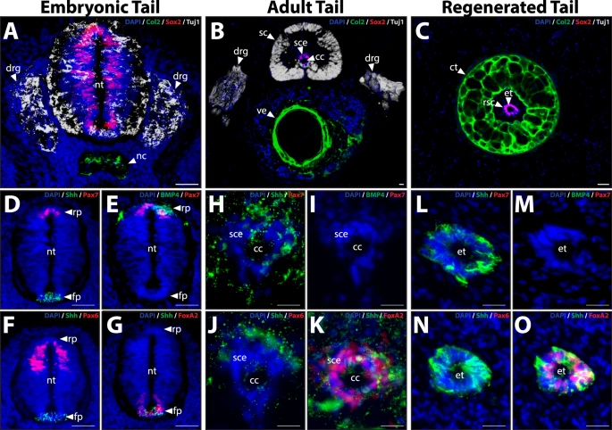 Aunque se sabe que los lagartos poseen la capacidad de regenerar sus rabos cuando los pierden, los nuevos miembros no son iguales a los que tienen de nacimiento. En lugar de tener columna espinal y nervios, la nueva estructura regenerada es un tubo de cartílago.