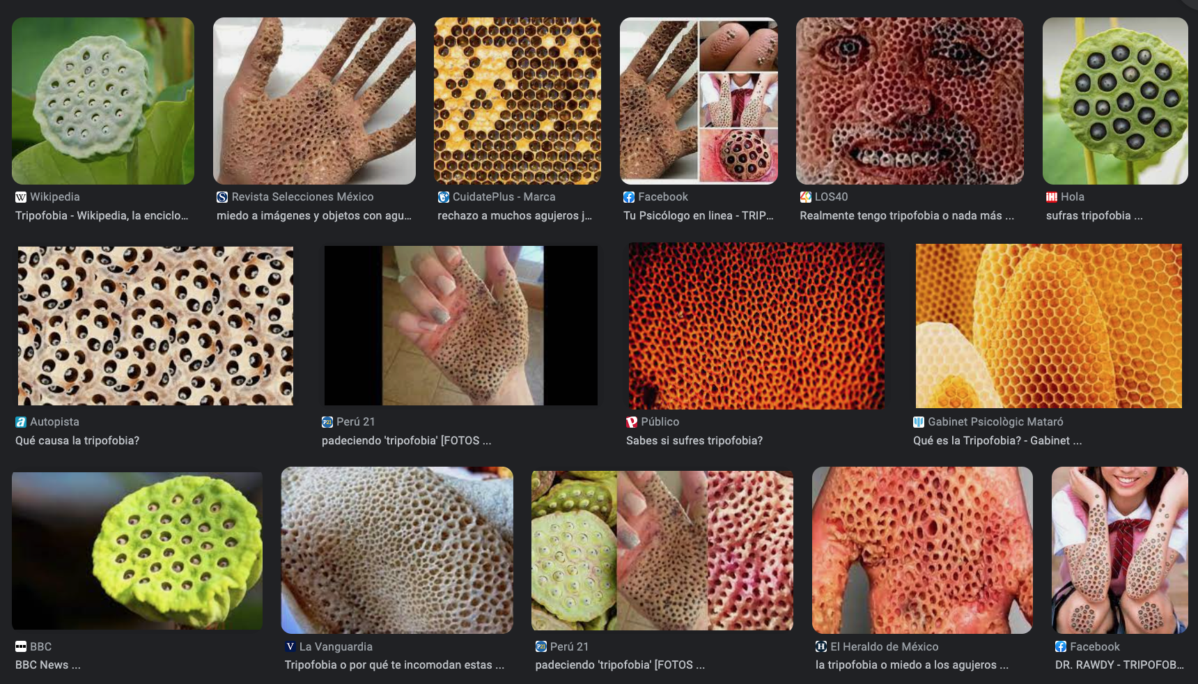 Las causas exactas de la tripofobia aún no se comprenden completamente. Sin embargo, se cree que la exposición a patrones de agujeros repetitivos, como en colmenas o en plantas como el loto, puede desencadenar la fobia en algunas personas. Los síntomas de la tripofobia incluyen ansiedad, náuseas, sudoración y, en algunos casos, ataques de pánico.