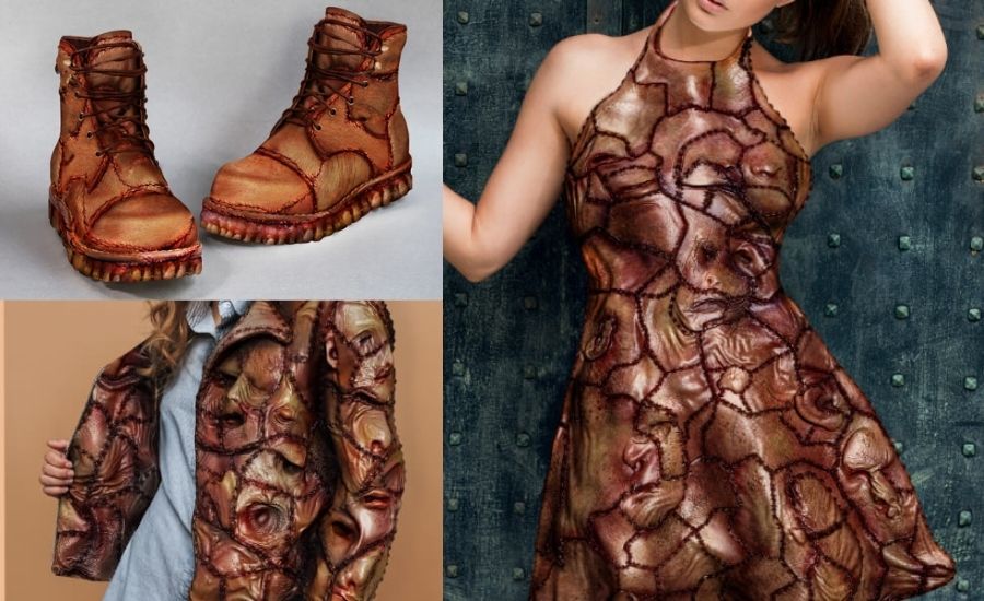 Pero mire más de cerca y verá rostros humanos en las chaquetas, dientes sonrientes en las suelas de los zapatos y sangre brotando de las bolsas.