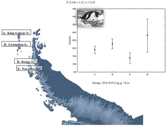 La concentración más elevada de mercurio fue encontrada en el plumaje de pingüinos barbijo en la isla Rey Jorge, zona con una superficie de aproximadamente 95 km de longitud y donde se encuentra el único asentamiento humano permanente en el área.