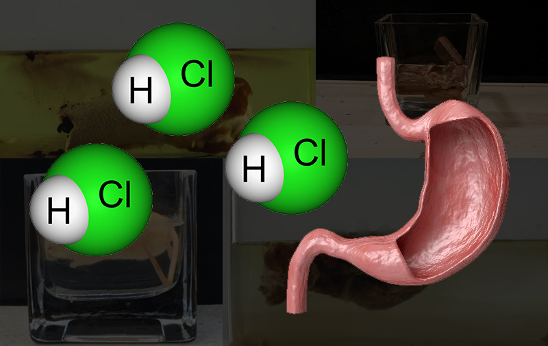 Cabe mencionar que en estos videos lo que utilizaron fue ácido clorhídrico al 33%, y el ácido estomacal está compuesto químicamente por agua, ácido clorhídrico, trazas de cloruro de potasio, cloruro de sodio, bicarbonato, enzimas y mucus.
