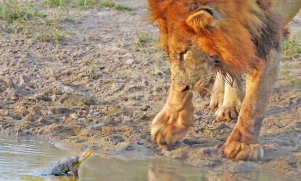 La escena de la tortuga y los felinos tuvo lugar en el Parque Nacional Kruger, en Sudáfrica, se muestra el momento en que la tortuga aparece en el arroyo y se acerca hasta el sitio donde una pareja de leones se había acercado a beber. El reptil se va acercando de forma lenta hasta situarse de forma muy próxima frente a la cara del felino, el cual no le presta atención, sin embargo el pequeño animal sigue insistiendo en acercarse, algunos medios han mencionado que lo hacía para “obligarlos a que se alejaran de su territorio”.