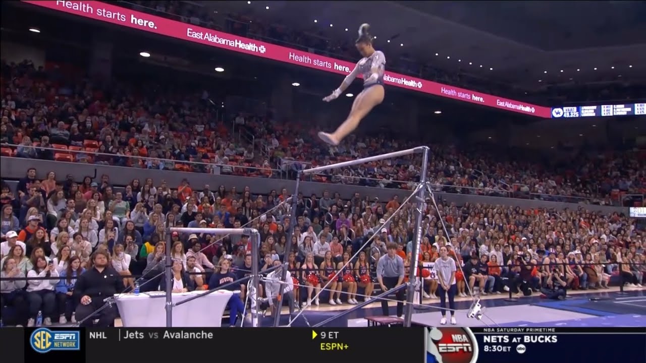 Suni Lee consiguió la calificación más alta en una competencia de Universidades al realizar una Nabieva durante una rutina de barras asimétricas.